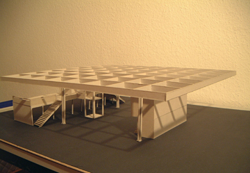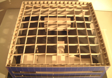 Ein Gitterrost mit einem Raster von 3,50m x 3,50m bildet das Haupttragwerk. Dieser steht auf vier eingespannten Stützen, die Aussteifung übernehmen Kerto- Platten. Dieses System ist unabhängig von der Fassade und sonstigen Einbauten. Die Fassade hat einen Abstand von 1,00m vom Trägerrost um die Abkopplung des Tragwerkes ersichtlich zu machen.